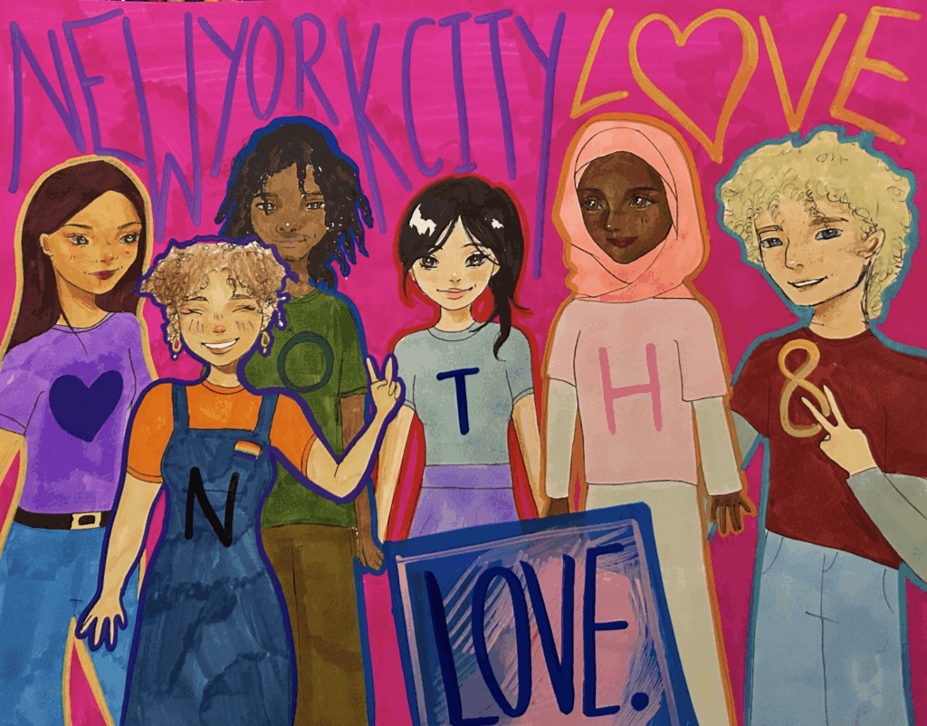 Their artwork brings together young people of different backgrounds, standing side by side under the words “New York City Love.” Each figure wears a t-shirt with letters and symbols that, altogether, read “Love, Not Hate”