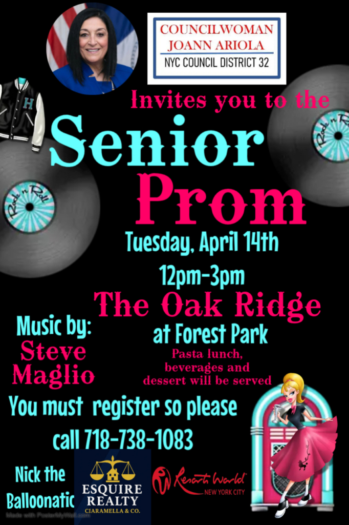 The senior citizens of District 32 are invited out to the legendary Oak Ridge in Forest Park for a day of fun, music, dancing, and more! Attendees must register, so call 718-738-1083 if interested!