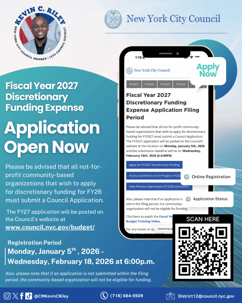 Council Member Kevin C. Riley’s office is excited to announce that the New York City Council Discretionary Expense Funding application portal for Fiscal Year 2027 is now open. Applications will close promptly on Wednesday, February 18, 2026, at 6:00 PM. Please note: Also, please note that if an application is not submitted within the filing period, the community-based organization will not be eligible for funding.