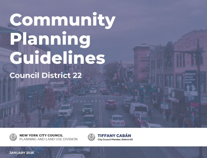 The decision to focus on Council District 22 reflects several converging factors, including outdated zoning that no longer aligns with existing land uses, a recurring pattern of private rezoning applications, and piecemeal development without any coordinated public investments to support growth, infrastructure, and community priorities. The District 22 Community Planning Guidelines report covers key topics including housing, land use and zoning, transportation, open space, resiliency, and community amenities, in addition to the community planning guidelines. This report is meant to serve as a resource for the Office of Council Member Cabán, community groups, city agencies, private developers, and other partners to make informed decisions about the district’s built environment and neighborhood services.